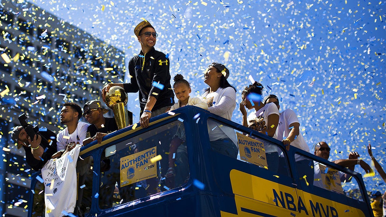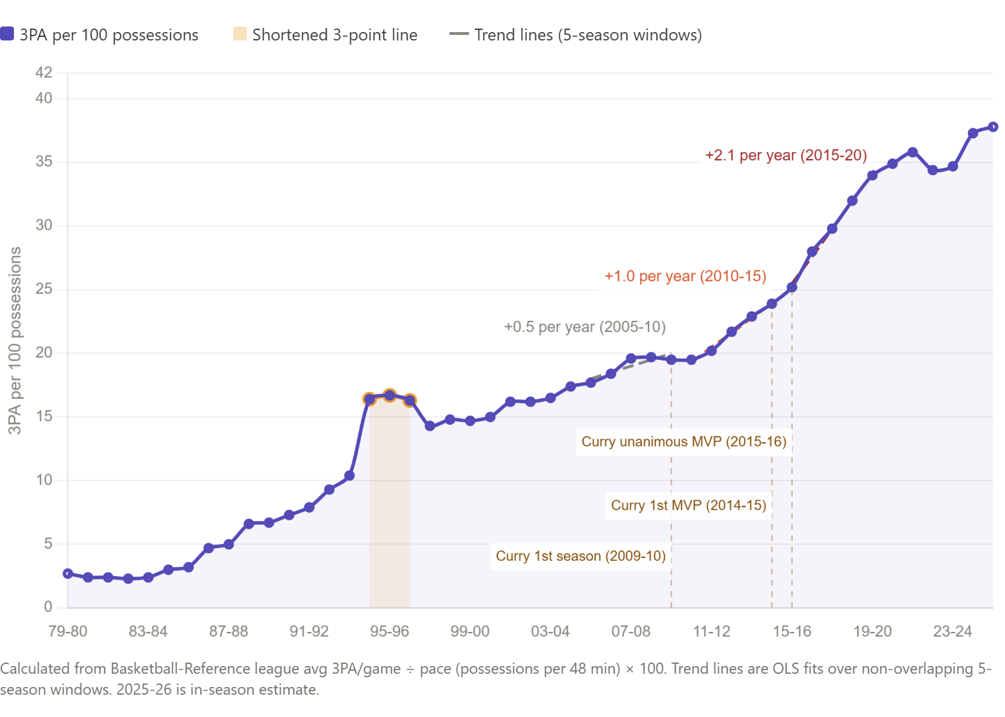 Nobody else yet has come close to joining Steph all the way out at the long-range volume-efficiency frontier. Not for lack of trying: general managers wantonly drafting wannabes, coaches giving them the green light, and everyone chucking with gleeful abandon. The 3-point attempt rate leapt from 24% in Steph’s first MVP season to 34% five seasons later. In a copycat league, the time when the game changed beyond recognition, and sharpish, wasn’t when three being greater than two became knowable, or known, or written down, but when it rained down, night after night in glorious high definition, as the greatest show on earth, and ended in a parade.